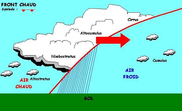 On parle de front chaud lorsque l'air chaud progresse vers une zone d'air froid. Comme l'air chaud est moins dense, il glisse au-dessus de l'air froid et provoque la formation des nuages en s'élevant. Souvent, des pluies prolongées précèdent le déplacement d'un front chaud.